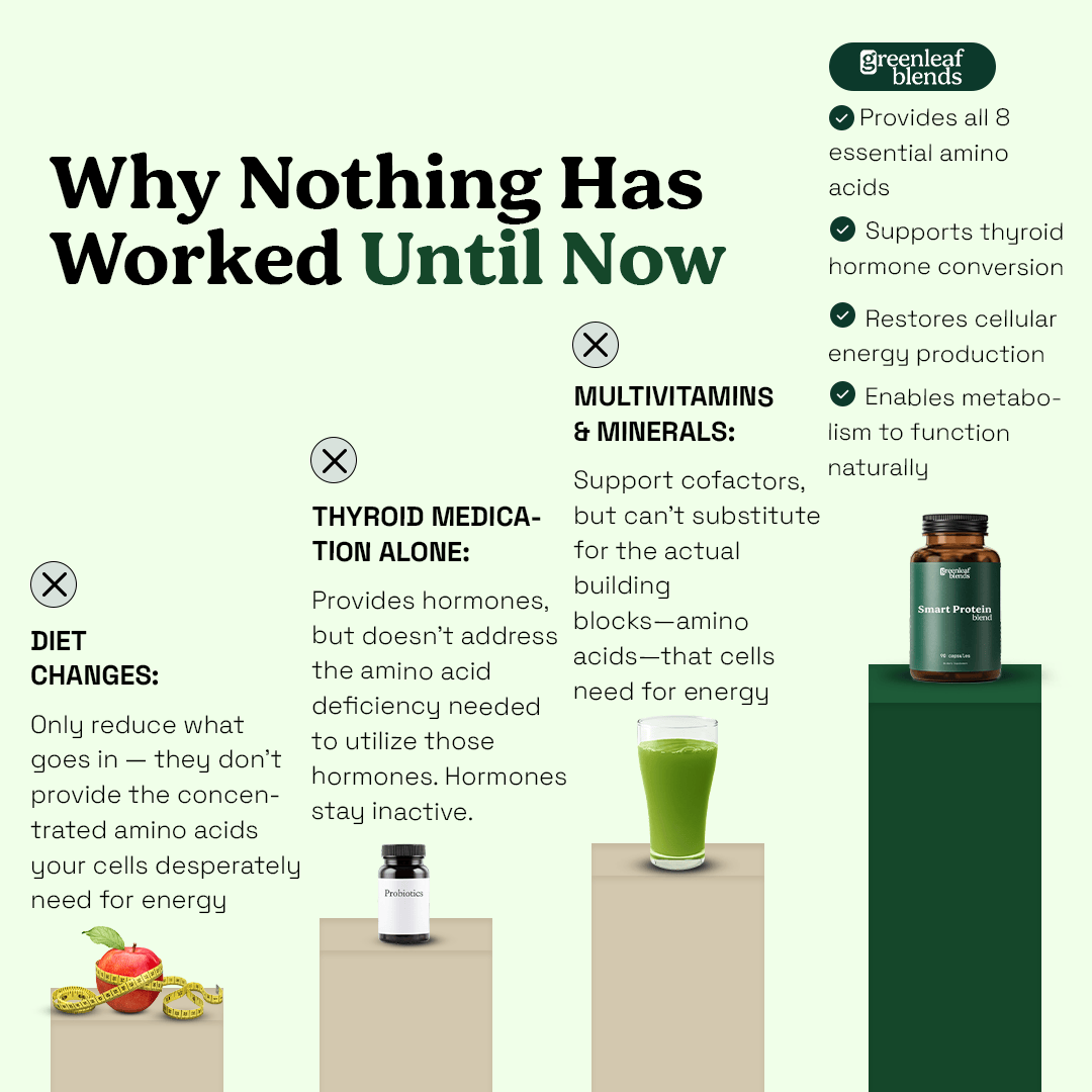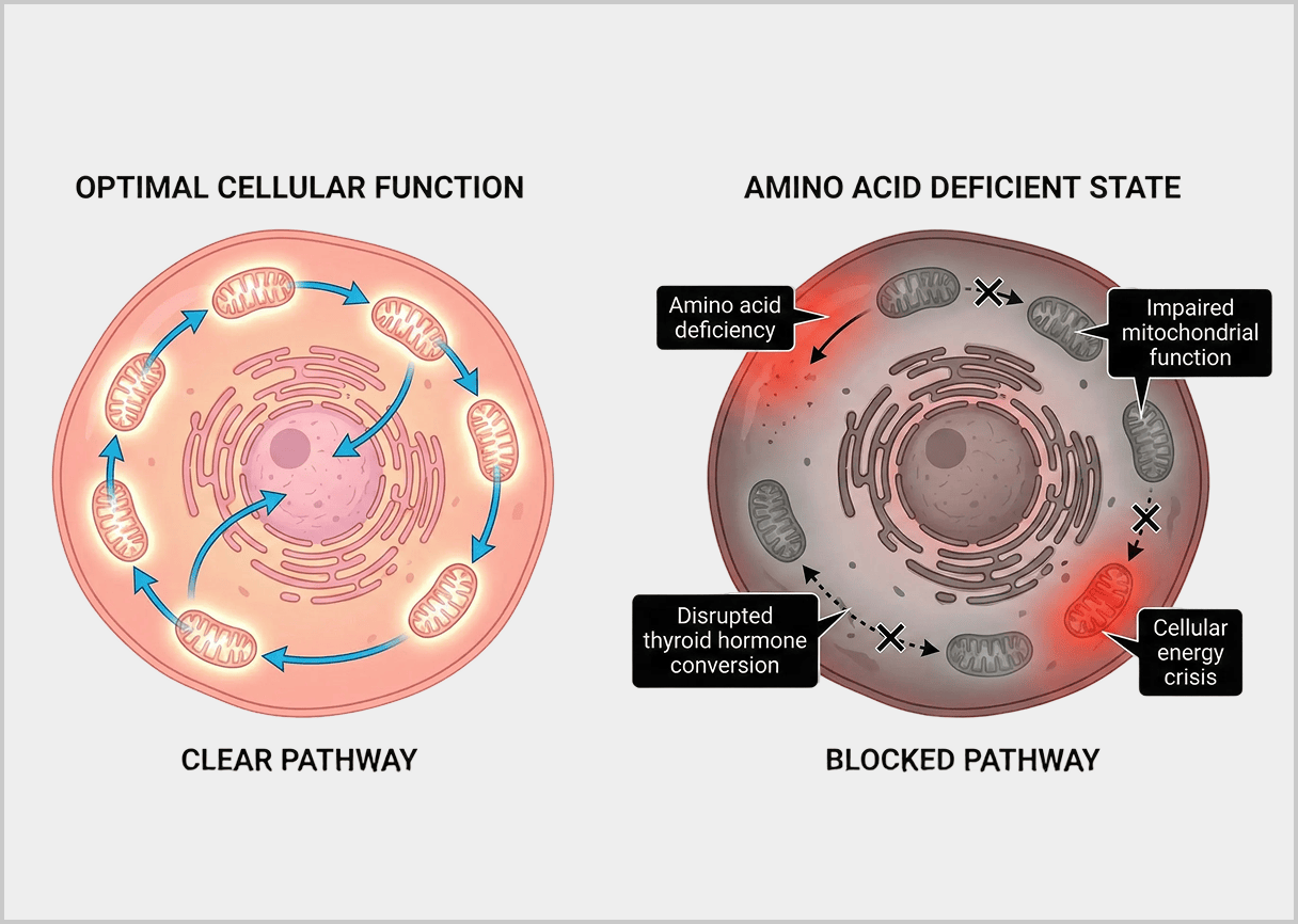 Thyroid medication provides hormones, but if your cells lack the amino acid building blocks to utilize those hormones effectively, you'll still experience symptoms. It's like having fuel but no engine parts.