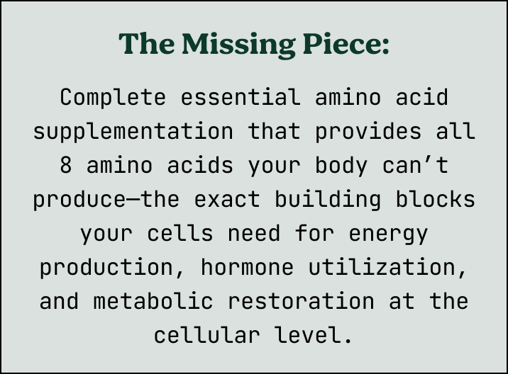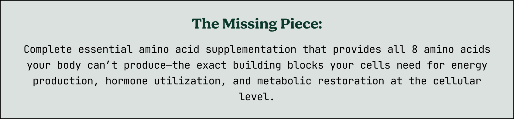Medication provides hormones, but if your cells lack the amino acid building blocks to utilize those hormones effectively, the underlying metabolic dysfunction continues. You're adding fuel to an engine that's missing critical parts.
