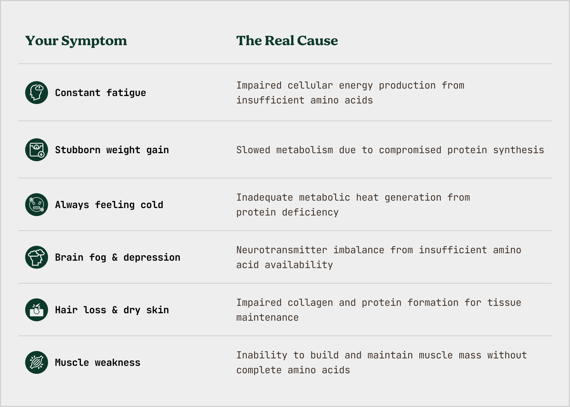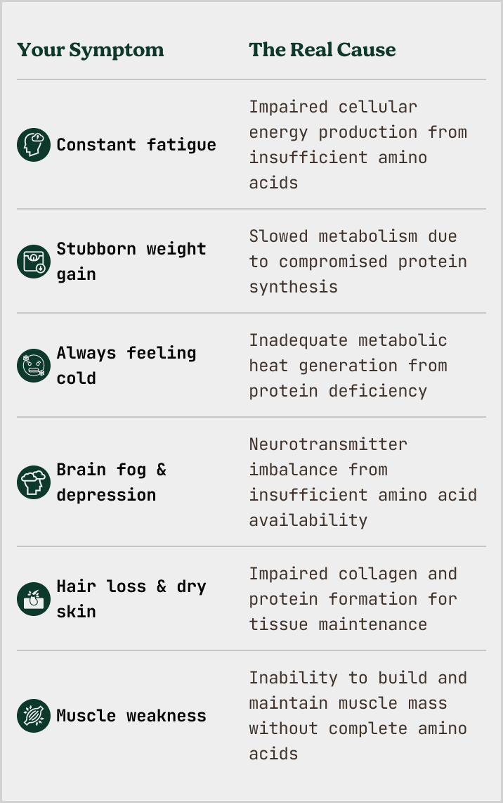 By addressing protein deficiency at the cellular level, it supports optimal thyroid function, restores natural energy metabolism, and helps your body regulate temperature, weight, mood, and cognitive function naturally.